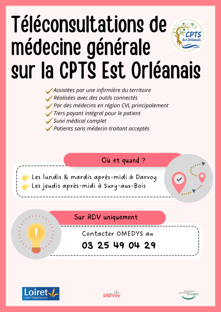 Dans une démarche continue d’amélioration de l’accès aux soins, nous renforçons l’offre de téléconsultations assistées par un infirmier sur le territoire de la CPTS Est Orléanais, auquel votre commune appartient.